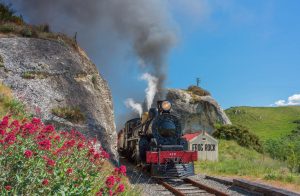 A series of 5 sweeping left hand curves on high embankments, flanked on both sides by limestone cuttings, carry the line towards Frog Rock. On the last of those curves, the gradient reaches 1 in 47, the ruling gradient of the Weka Pass Railway. Frog Rock and Seal Rock are passed around 9 kilometers in to the journey. The cutting walls contain fossilized indications that this land was thrust out of the ocean millions of years ago.